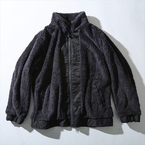 毛足の長いボアフリースをメインに、ポイントでポリエステルを切り替えた異素材使い。ソフトな着心地を楽しめるうえ、インナーにスウェットが着込めるワイドフィット。