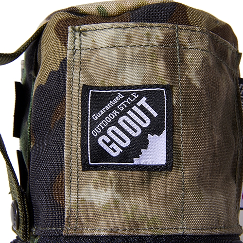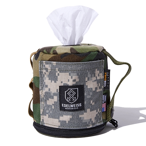 5種類の迷彩パターンを大胆にドッキングしたGO OUTだけの特別カラー。トイレットペーパーの芯を抜いて入れると、中央のハトメから取り出せる便利な一品です。