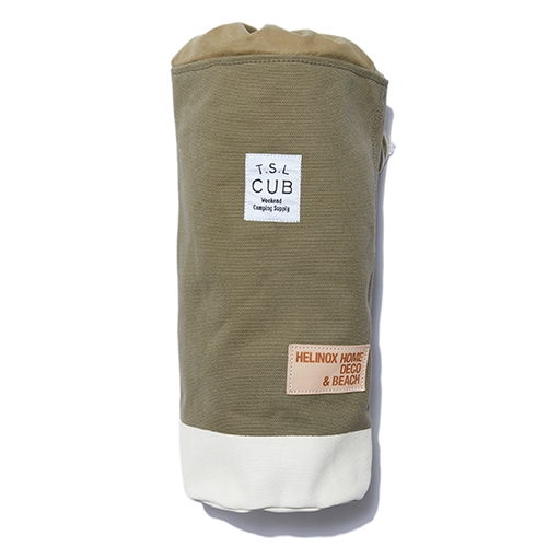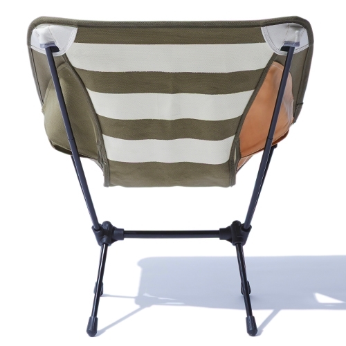 ヘリノックスのフラッグシップモデルをアレンジした別注モデルは、座面に用いたタフな帆布生地がポイント。背面のハンドペイント、片側のレザーポケットが存在感たっぷり。