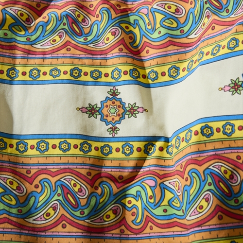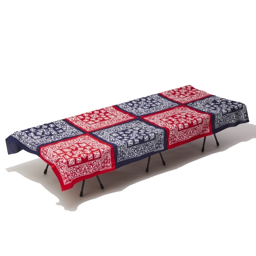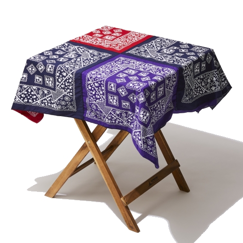 USメイドのクラシックなバンダナを8枚も使って繋ぎ合わせて別注。首に巻けばストールとして使え、コット・テーブル・ソファに掛けると空間を彩るインテリアとしても活躍。