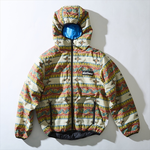 幾何学的なカシミール模様の総柄プリントと、大胆に配色を切り替えたバイカラー。表裏で表情が異なるリバーシブルジャケットを、プリマロフトの上質な中綿を使って製作。