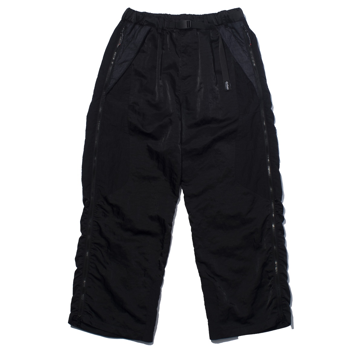 ジャケットと共地を使用しつつ、こちらは一つひとつ丁寧にガーメントダイを採用。同じものが2つとない風合いを醸し出し、シルク調の光沢感が出るように特別な加工をオン。縦長のサイドジップは米軍の“ECWCS”からインスパイア。