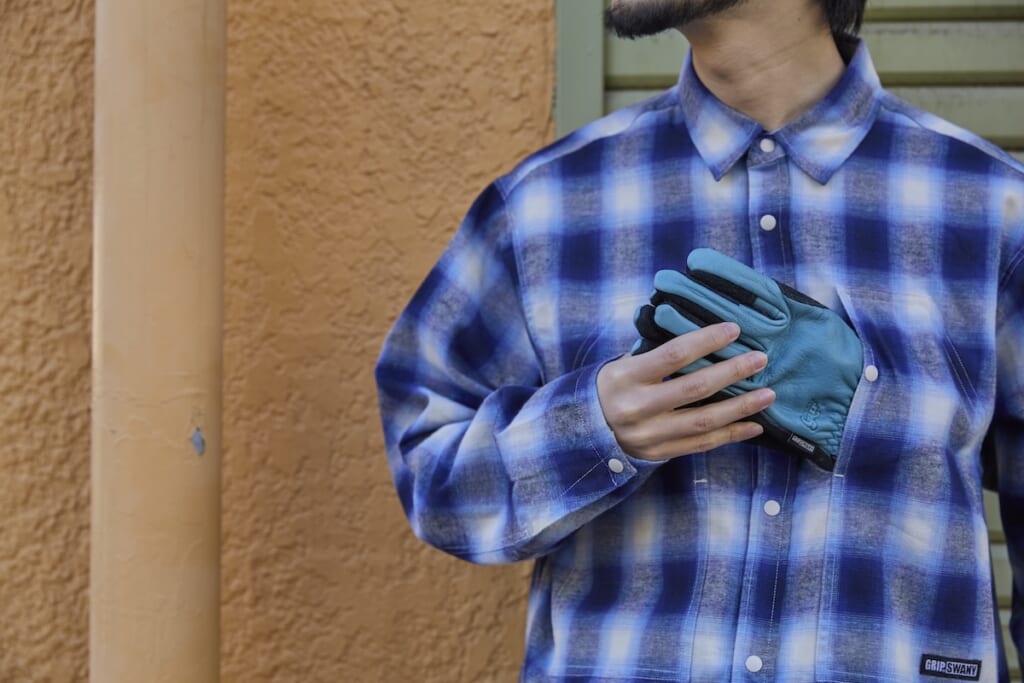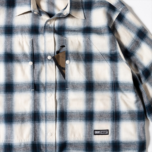 胸元にギアが出し入れできるポケットを備え、アメカジ定番のチェックシャツをグリップスワニー流にアレンジ。スナップボタンを使うことでスムーズに脱着が可能。