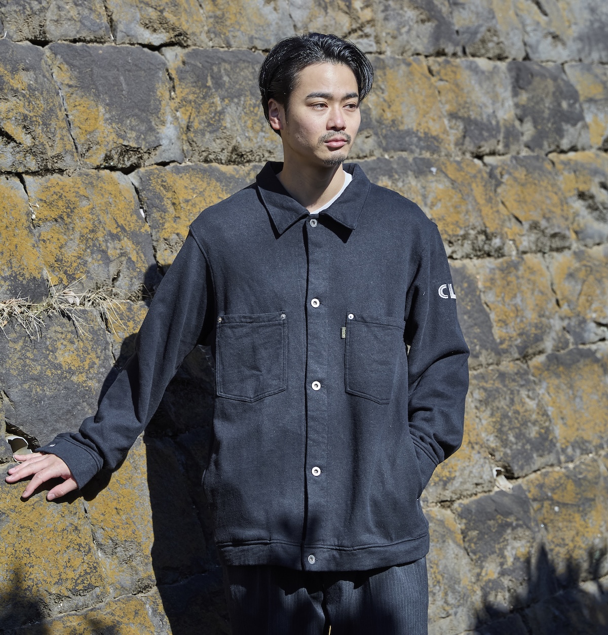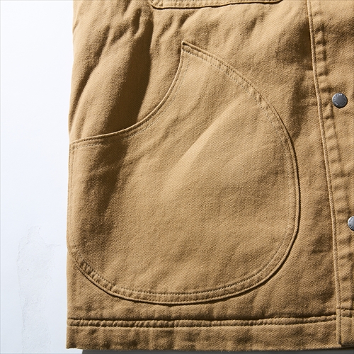 Gジャンタイプのシンプルなトップスを、ヘンプ混の透湿性に優れた天然素材を用いてデザイン。フロントのポケットに打ち込まれたリベットが無骨な雰囲気を演出。