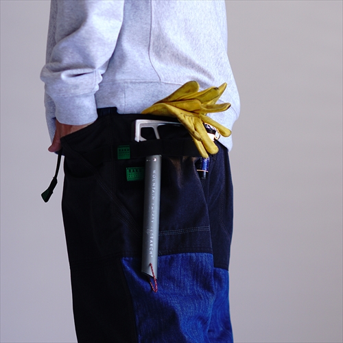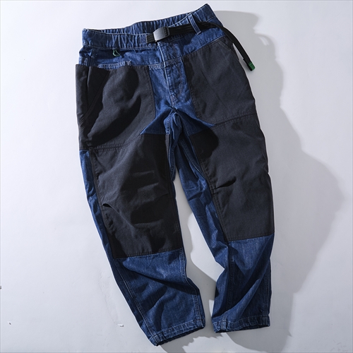 膝部などに難燃性のあるダイナモナスを切り替えたうえ、左サイドにはデイジーチェーンをレイアウト。アウトドア仕様のディテールをシンプルなデニムパンツに搭載。