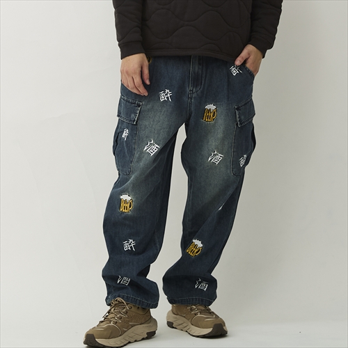 USカジュアルを代表するカーゴパンツに、酒にまつわるモチーフをランダムに刺繍。引き裂き強度の高いリップストップ生地、ユーズド加工を施したデニムの2タイプを用意。