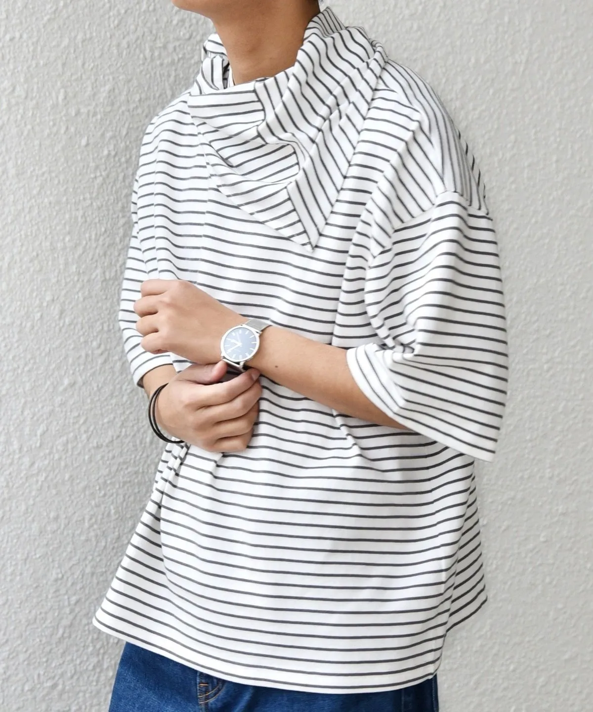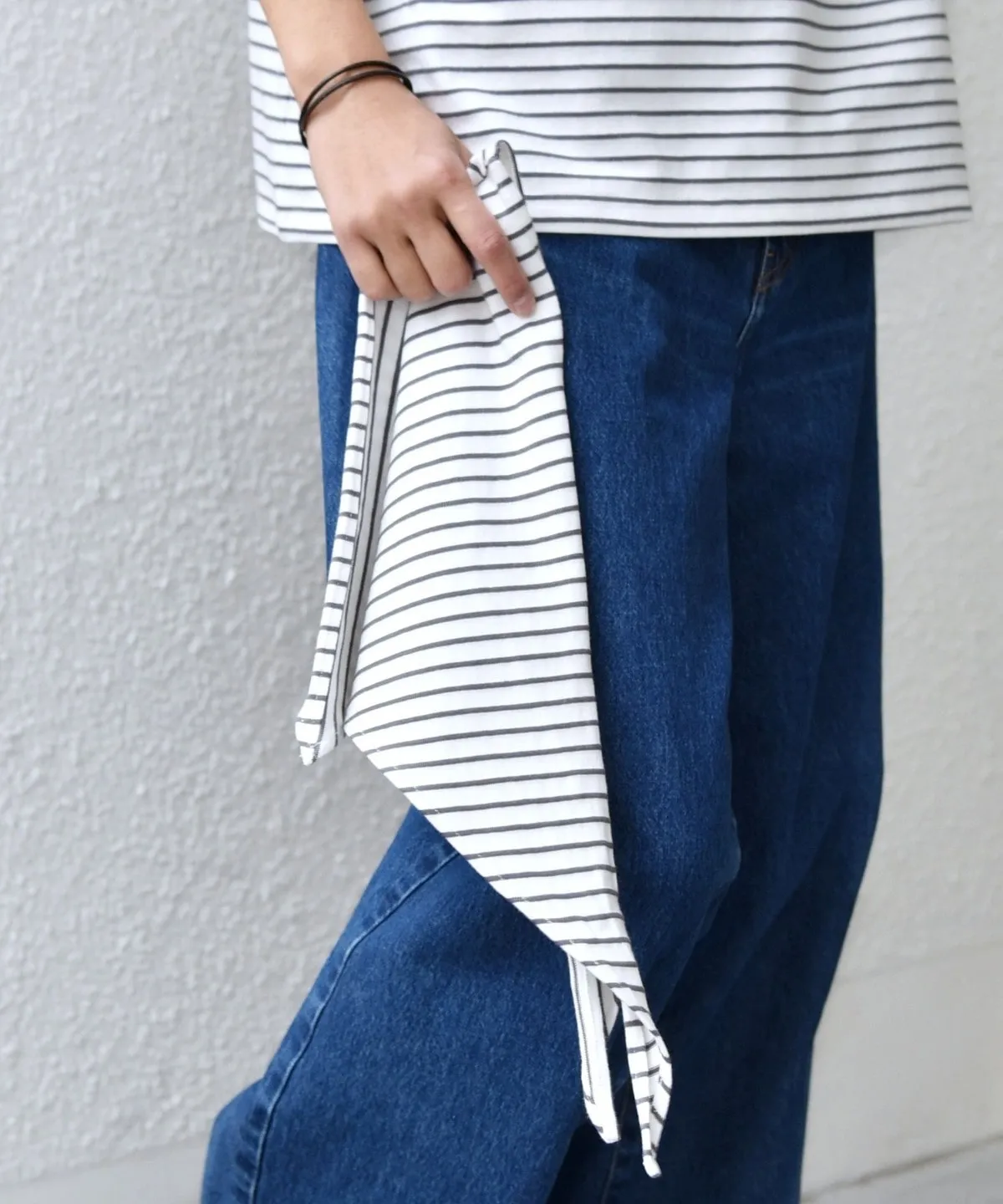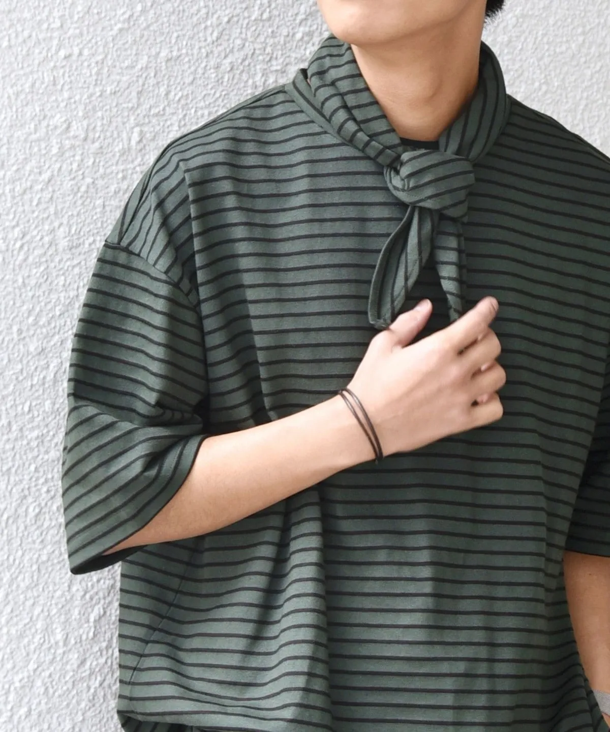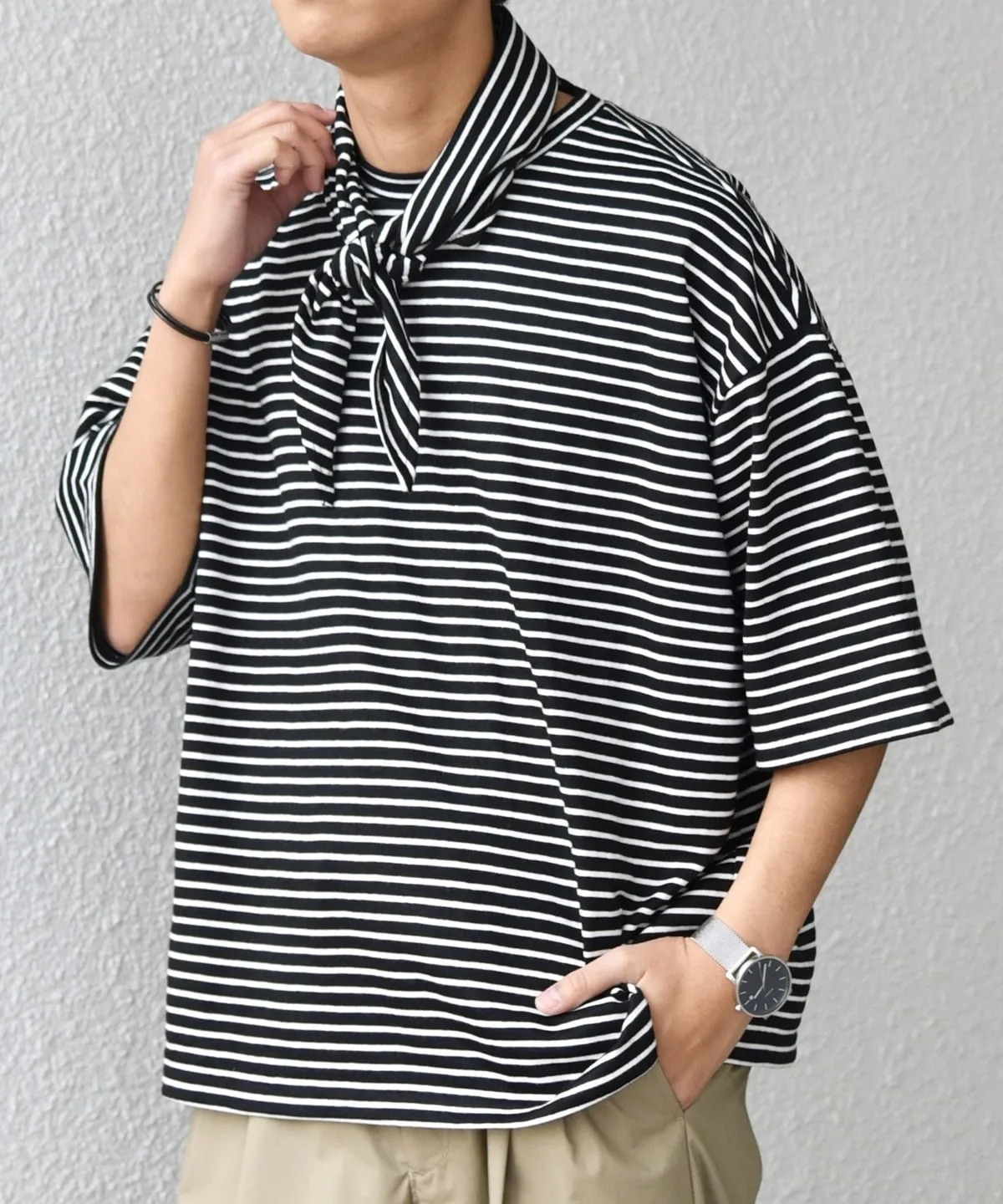 細ピッチのボーダーパターンをまとった、身幅が程良くワイドな Tシャツに、ボディと共地を用いたスカーフとセットというのがポイント。首元にアクセントが加えられ、マリンテイストなデザインを引き立てます。