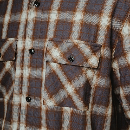 陰影の効いたチェック柄に加え、胸元のフラップポケットや猫目ボタンをはじめ、ヴィンテージのシャツを再現。コットン100%のボディはタフに着こなせます。