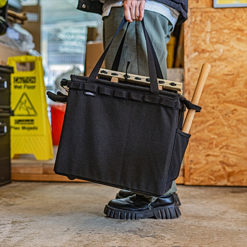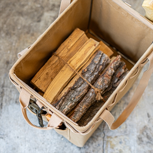 ワンタッチでコンパクトに折り畳める、同ブランドの人気モデルを頑丈な帆布で製作。薪などの重量感のある荷物が持ち運べ、サイドにアックスを収納するためのポケットを配置。