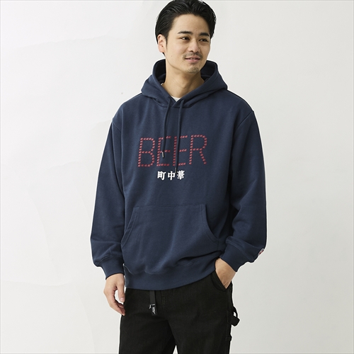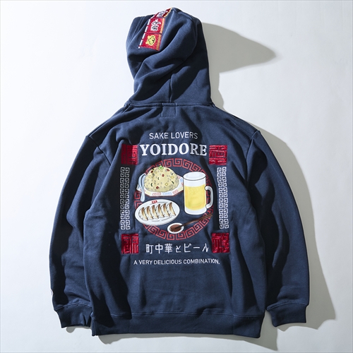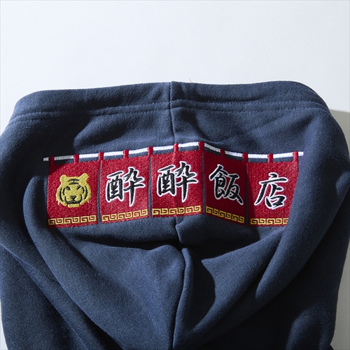 モデル名のように町中華とビールを愛する、酒好き圧巻のデザインをバックにレイアウト。フードを被ると暖簾をイメージしたトップの刺繍がアクセントに。