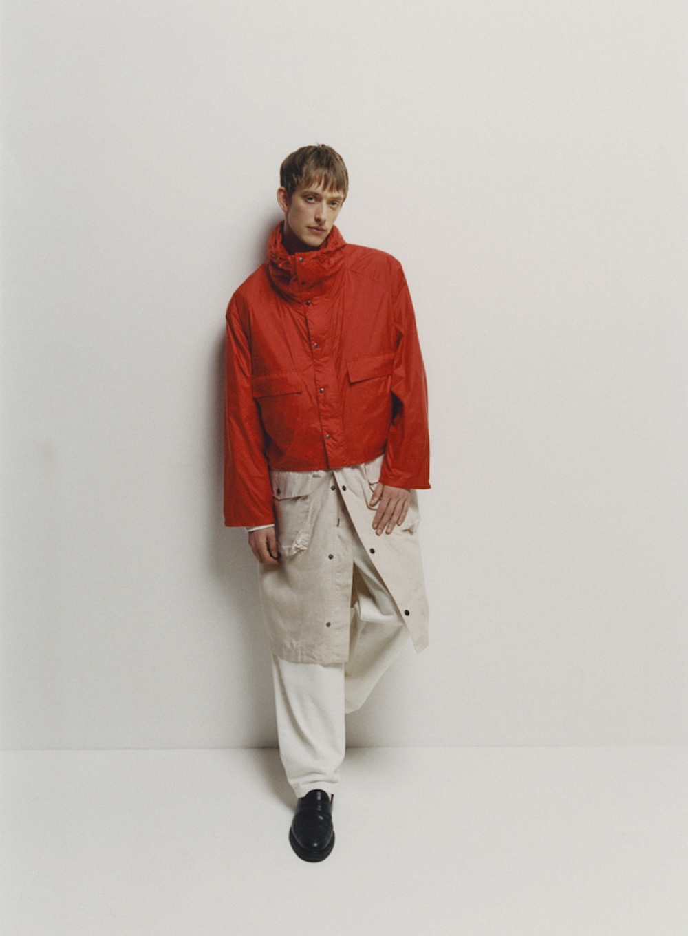 こちらはセーリングジャケットをリソースに。キャンバス素材のスモックジャケットに、防風性を備えたコントラストカラーのオーバーレイヤーを組み合わせた 2-in-1 デザインが特徴的。裾のドローコードやサイドジップなどの細かな芸にも注目を。