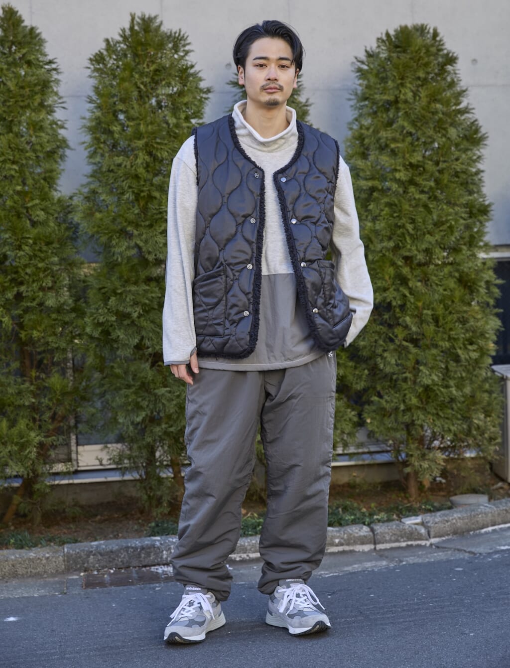 6層構造のベストに加え、モックネックのフリーストップ、裏ボア仕様のナイロンパンツをセレクト。初春の肌寒い時期でも快適に過ごせるコーディネートに。