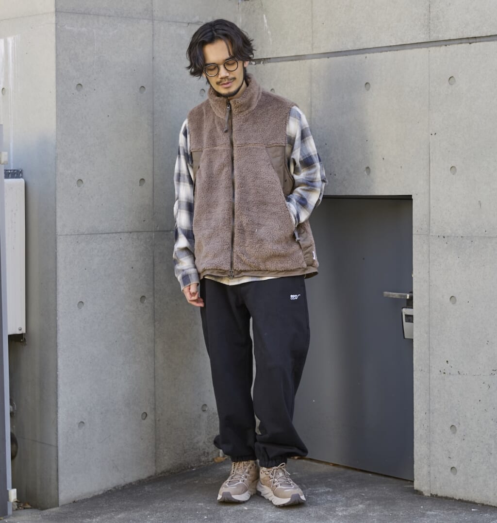 ソフトなボアフリースベストに合わせたのは、ゆったりとしたシルエットに仕上げたスウェットパンツ。陰影の効いたチェックパターンのシャツが、ラフな装いの引き締め役に。