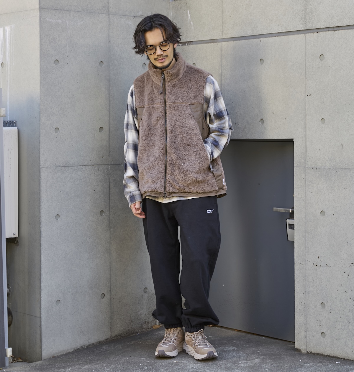 ソフトなボアフリースベストに合わせたのは、ゆったりとしたシルエットに仕上げたスウェットパンツ。陰影の効いたチェックパターンのシャツが、ラフな装いの引き締め役に。
