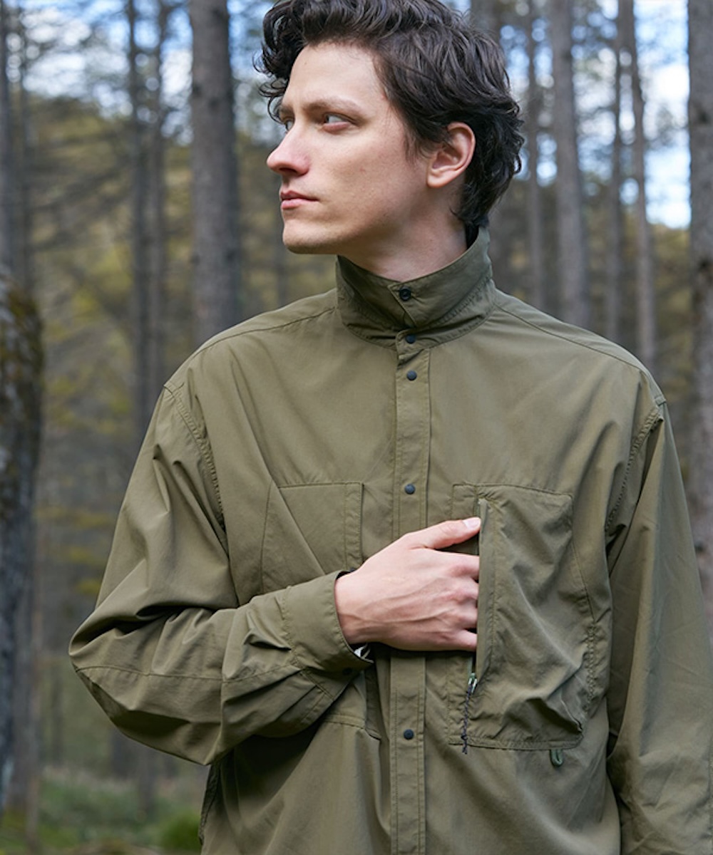 高密度に織り上げた CORDURA社の素材で織の密度が高いタイプライター生地を使用したシャツ。軽量ながら摩擦や引き裂きに強く、アウトドアシーンにはピッタリ。ハイクやトレッキングの動作に干渉しないポケットの配置や補強ディテールも備えています。