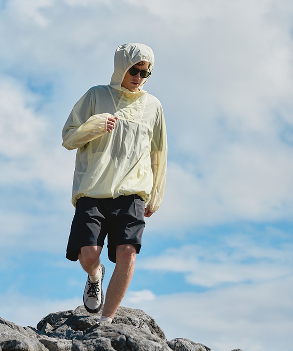 超軽量素材である CORDURA STRETCH BIG RIPSTOPを採用したオリジナルアノラック。 脇下のレーザーホールベンチレーションやフィット調整機能を備えつつ、デザインはあくまでミニマルに。 山間部の不安定な気候や、トレッキングでの相棒としても良さそうですね。
