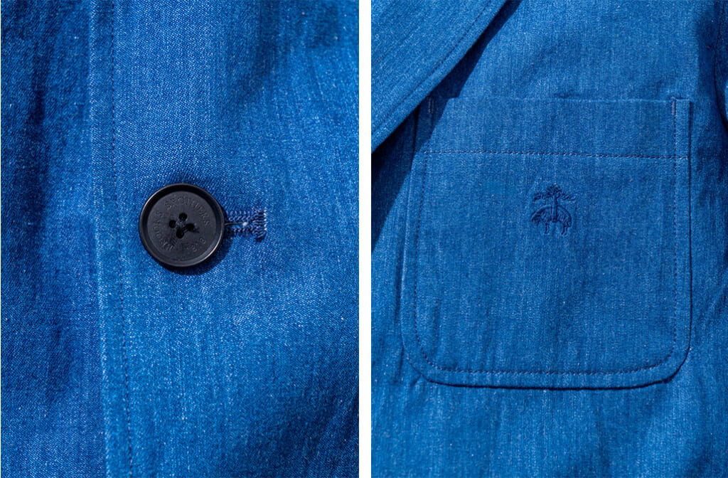 デザインはクラシカルな 3つボタンで、第 1ボタンを覆い隠す“段返り仕様”とし、ステッチを生地と同色にすることでスマートな佇まいに。さらに、ブルックスブラザーズの象徴である“ゴールデンフリース”の刺繍も控えめに施してアクセントをプラス! ボタンにも刻印が添えられている。