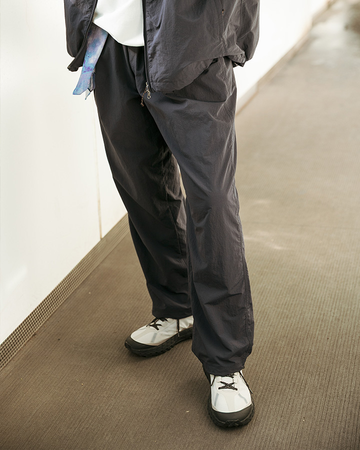 ワンタック入りで、ウエストからヒップにかけて程よくゆとりを持たせたテーパードラインを採用したイージーパンツ。裾にはドローコードが付属しているので、コーディネートに合わせたシルエット調整も可能。