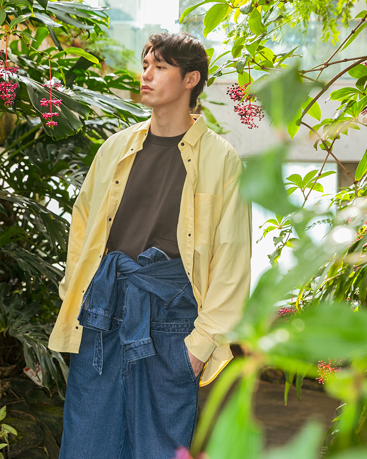 全体的にゆとりを持たせたボックスシルエットのレギュラーカラーシャツ。ドットボタンをフロントと袖口に採用しているので、着脱が簡単にできます。胸ポケット下には、ストレッチ性のあるコードを挟み込まれていて、ギアやガジェットを引っ掛けておくのに便利!