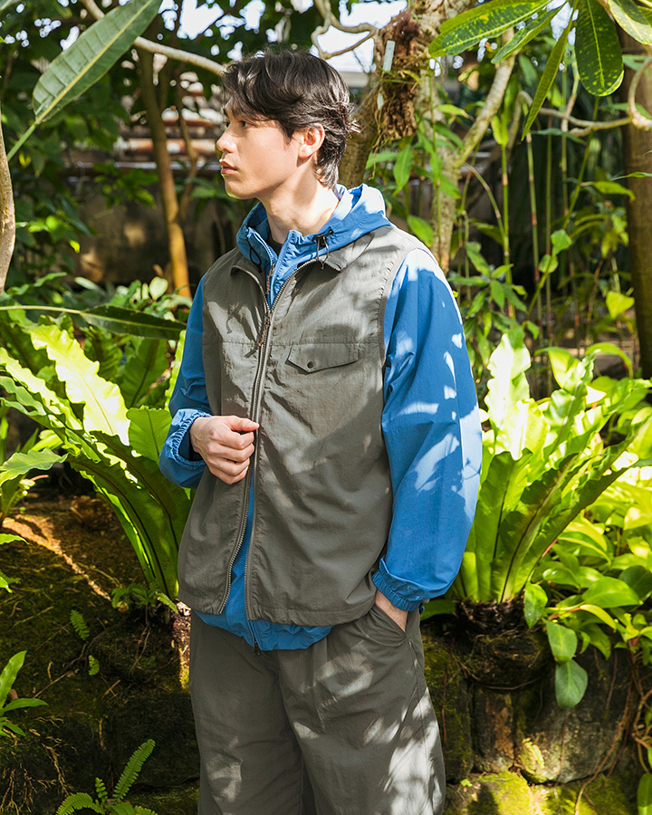フルジップアップ仕様のベストは、ゆったりとしたシルエットで、レイヤードのメインからインナー使いまで様々な着こなしができる万能型。両脇には縫い目を利用したファスナー付きのポケットが備わっていて、利便性もバッチリ。