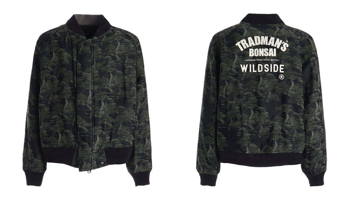 モノトーン調で大胆に刺繍を施したリバーシブルブルゾン。背面に五葉松模様木-銘「501」をグラフィカルなデザインに変え、裏地には五葉松、黒松、真栢模様木といったTRADMAN’S BONSAIが誇る名株をコラージュし、ジャガード織によって構築された総柄で、一見迷彩柄のようにも映るユニークなテキスタイルデザインに仕上げられている。