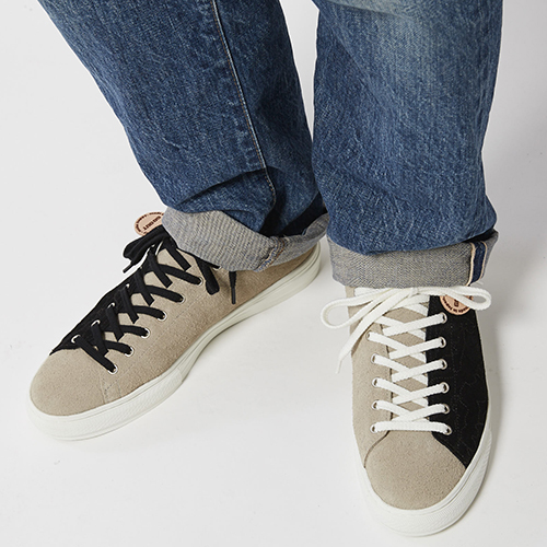 ブラックとグレーを大胆に切り替えたバイカラーで、両サイドは迷彩パターンをイメージしたステッチをオン。ベーシックなスニーカーでありながらも表情が豊かな一足に。