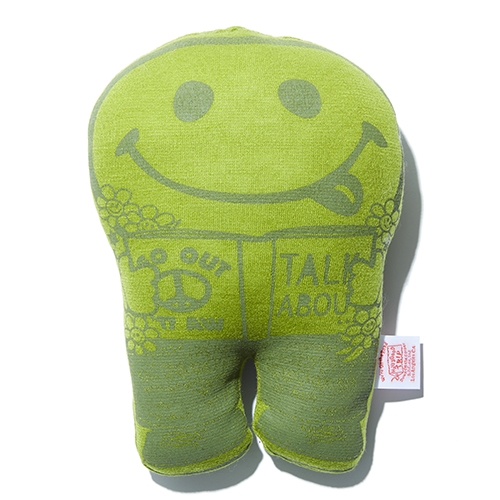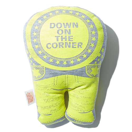 ポップなキャラクターを象ったクッションは、架空の雑誌を描いたコラボ仕様。表側だけでなく、ロゴやジーンズのディテールを精巧に描いた背面のデザインも注目。