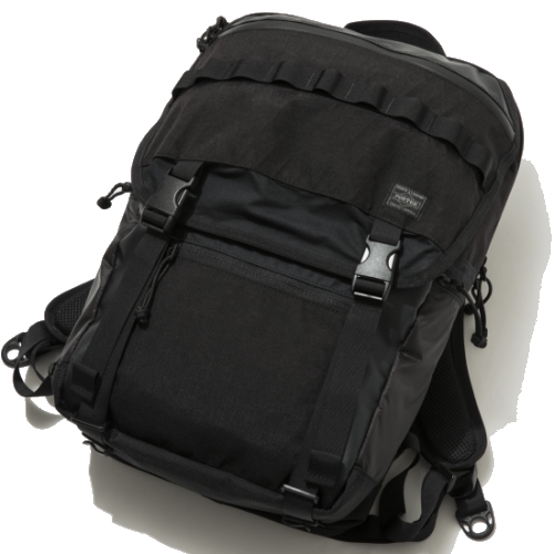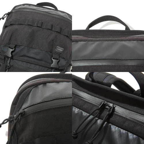 リップストップナイロンやコーデュラナイロンと、屈強な素材を用いたタフなデザイン。黒で統一しつつも異なる質感で奥深くデザインし、フロントにデイジーチェーンを配置。