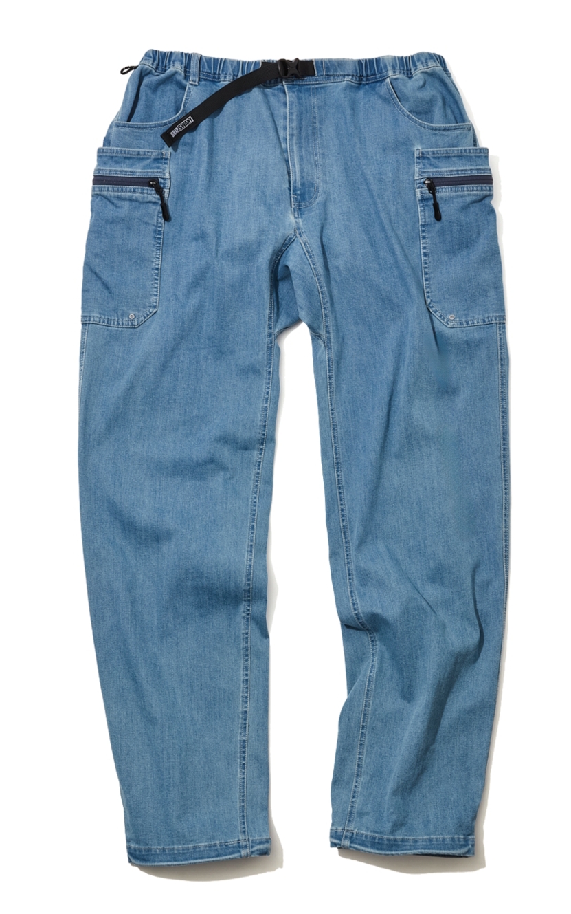 通気と吸水速乾性に優れるクールマックス製の8オンスデニムなので涼しく穿ける。ポケットが9個も配されており、バッグいらずの収納力。
