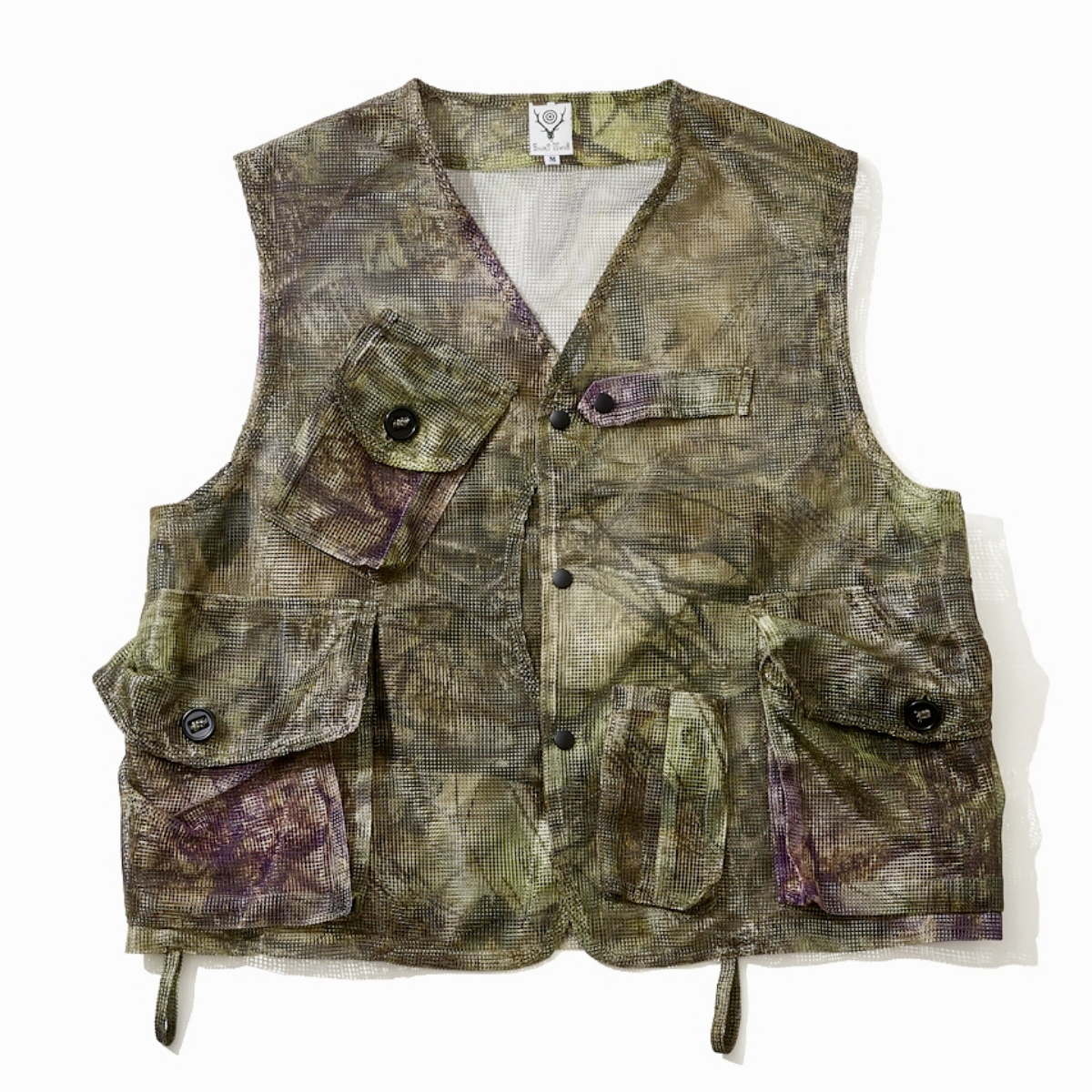 さりげなくパープルを効かせたオリジナルカモ柄のメッシュは、軽量で通気性が高く、レイヤード次第で表情が変わるのも面白い。着こなし甲斐あり。