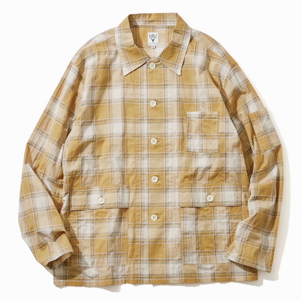 クラシカルでファジーなチェック柄をまとった新型シャツ。左胸にはオープンポケットを、両サイドには大ぶりのフラップポケットを備え、使い勝手も◎。
