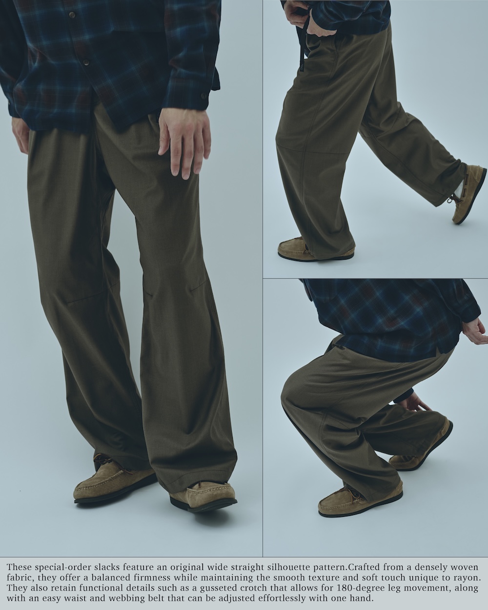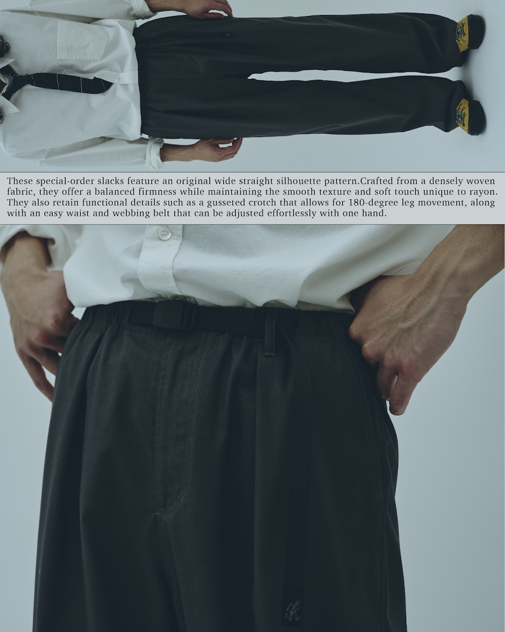 型から製作したという本作は、ゆったりとしたワイドシルエットが特徴的。180度の開脚を可能にしたガゼットクロッチ、片手で調整できるウェビングベルトはそのままに、まるでスラックスのような穿き心地が味わえる滑らかな質感のレーヨン素材がクセになる一本です。