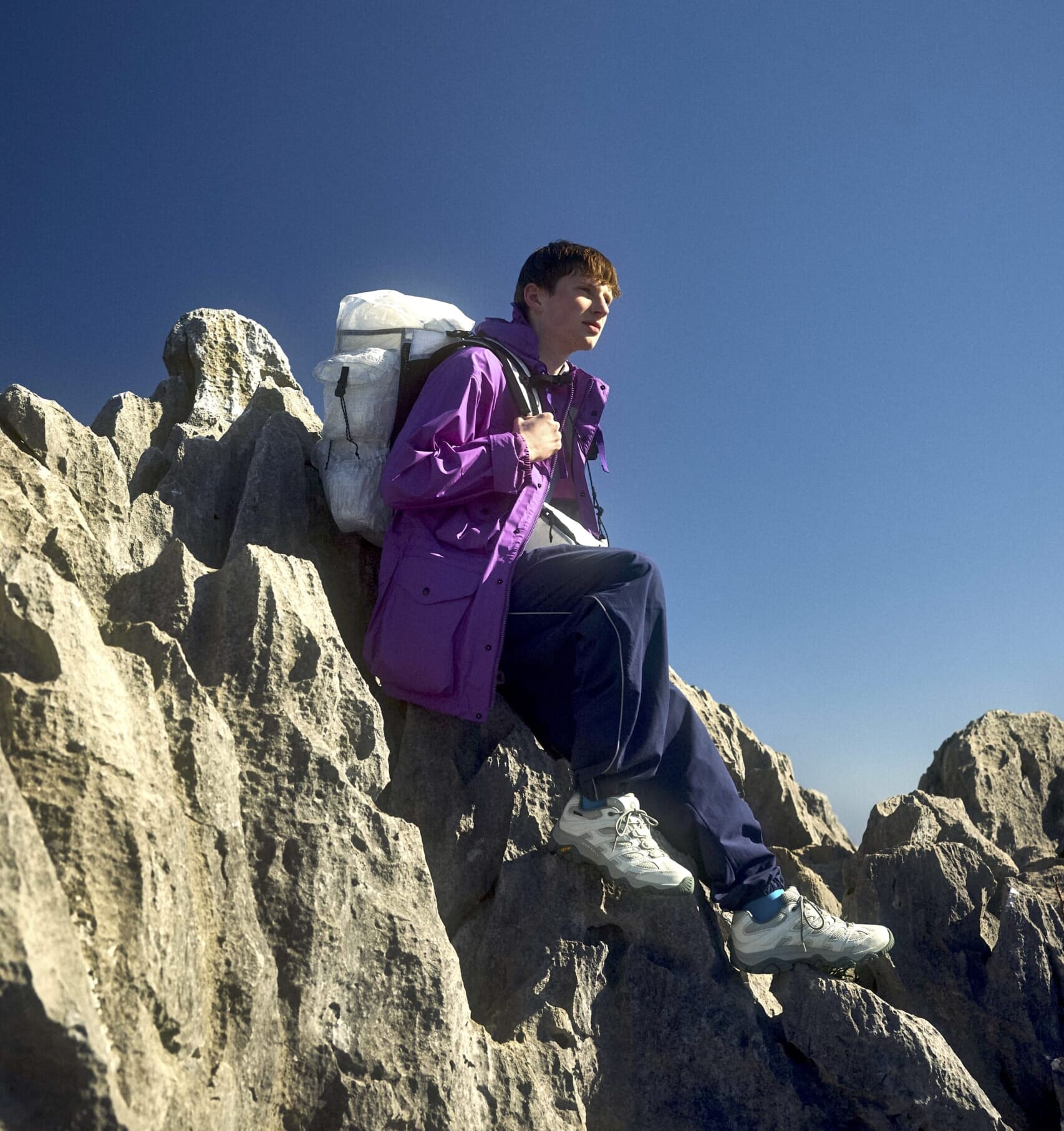 トレッキングシューズは、視認性の高いアクセントカラーやアースカラー、ブラックをベースにしたモデルが多いからこそ、ありそうでないクリーンな配色の“ウーロン”カラーは、フィールドでも目立つ。小物を同色で揃えたり、ソックスで差し色を入れたり、着こなしも楽しめる。