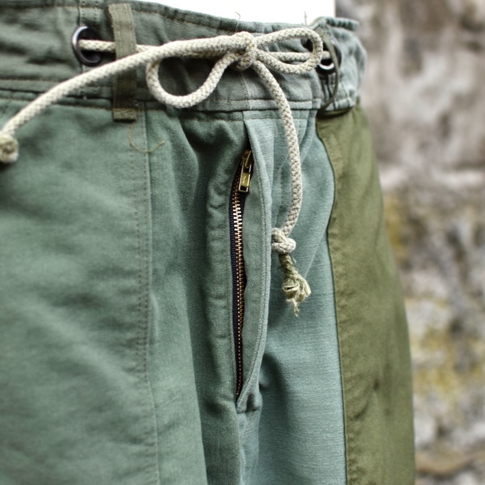 様々な年代のミリタリーファブリックを使用することで、カーキのコントラストが目を引く仕上がり。一点ずつバランスを見て配置したというカラーリングは、現存のミリタリーパンツとは一線を画します。この緻密さこそ、「レダッド」の真骨頂といえるでしょう。