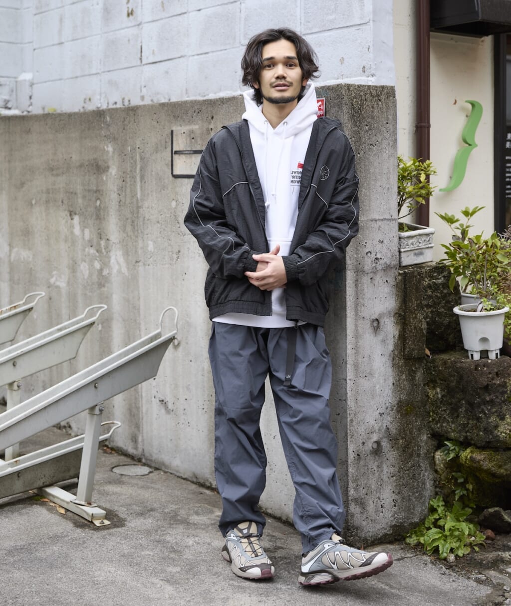 上下ともにナイロンボディで統一しつつ、ともに光沢感を抑えて落ち着いた雰囲気に。差し色となったスウェットパーカを合わせ、スポーティなエッセンスもさり気なく演出。
