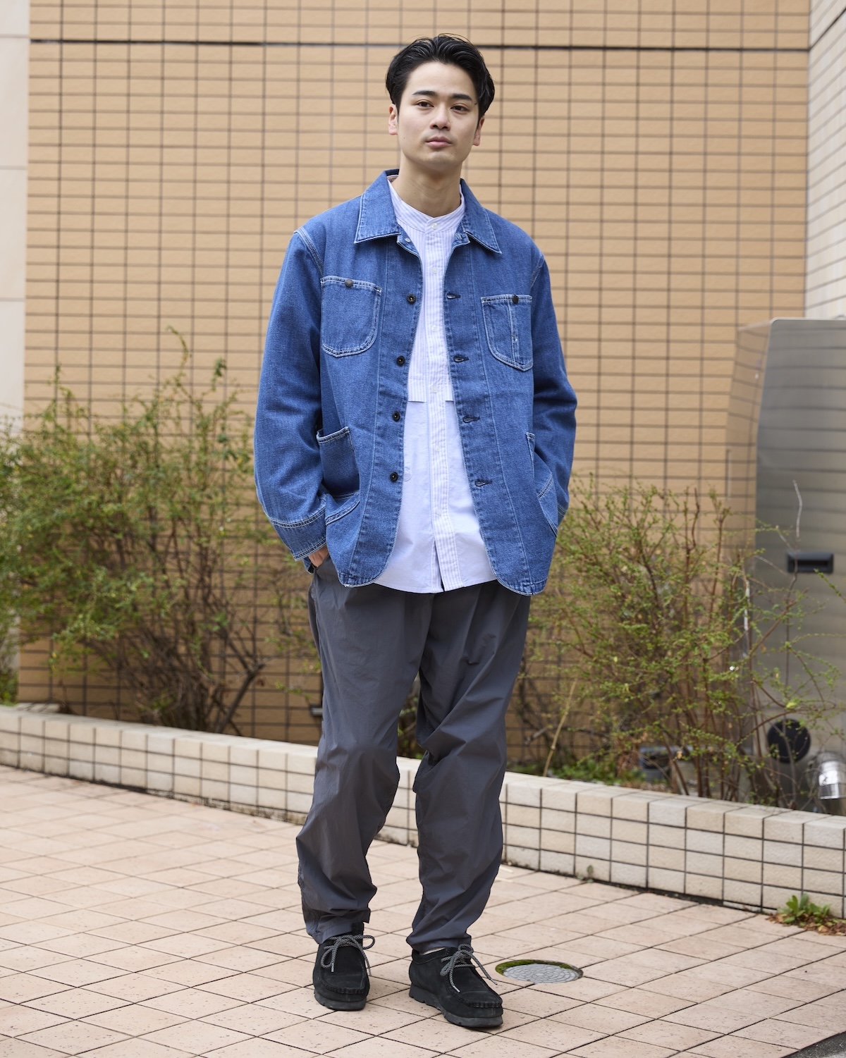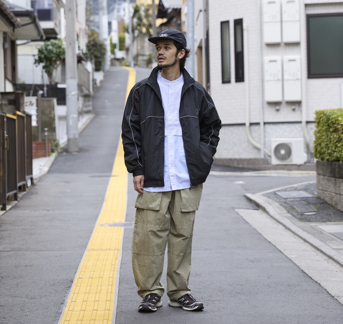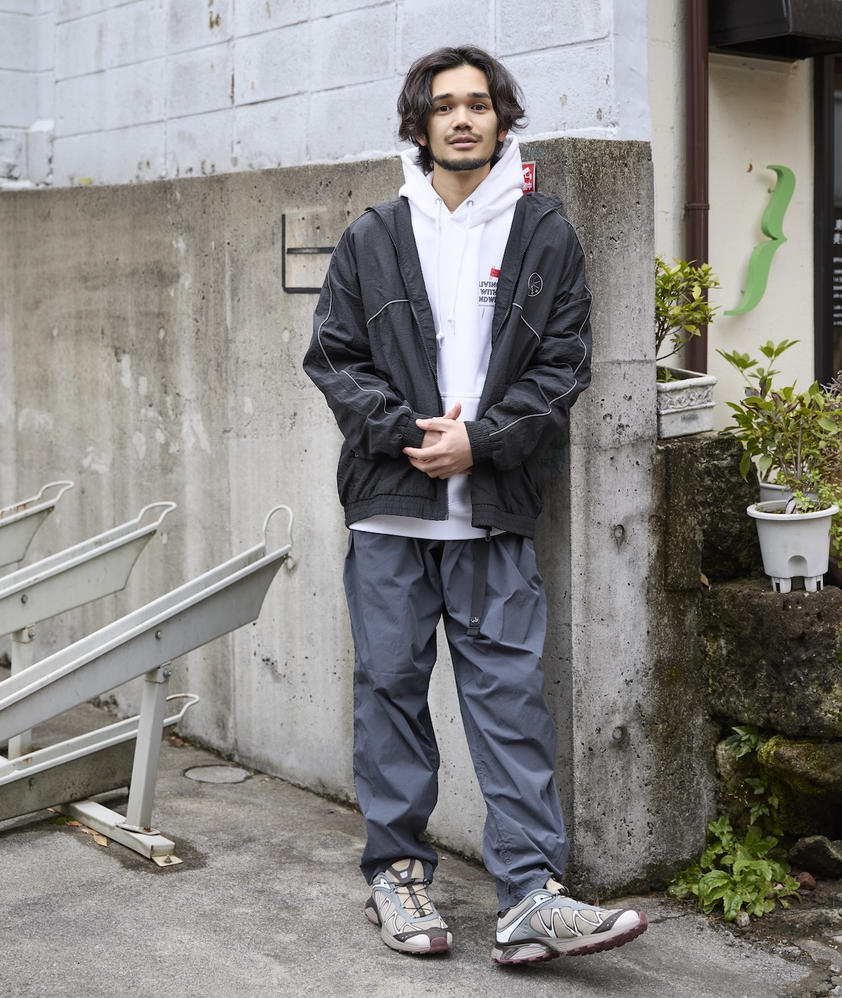 ナイロンのジャケットとオックス地のシャツ、パンツはピグメント染めを施したコットン×ナイロン。質感の異なるアイテムを重ね合わせ、シンプルながらも奥深い着こなしに。