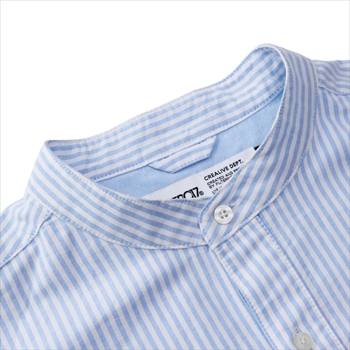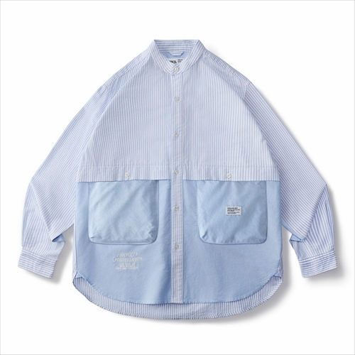 ストライプと無地を大胆に切り替えたうえ、胸元に膨らみのある立体的なポケットをレイアウト。主張性のあるデザインを取り入れ、普遍的なバンドカラーシャツをアレンジ。
