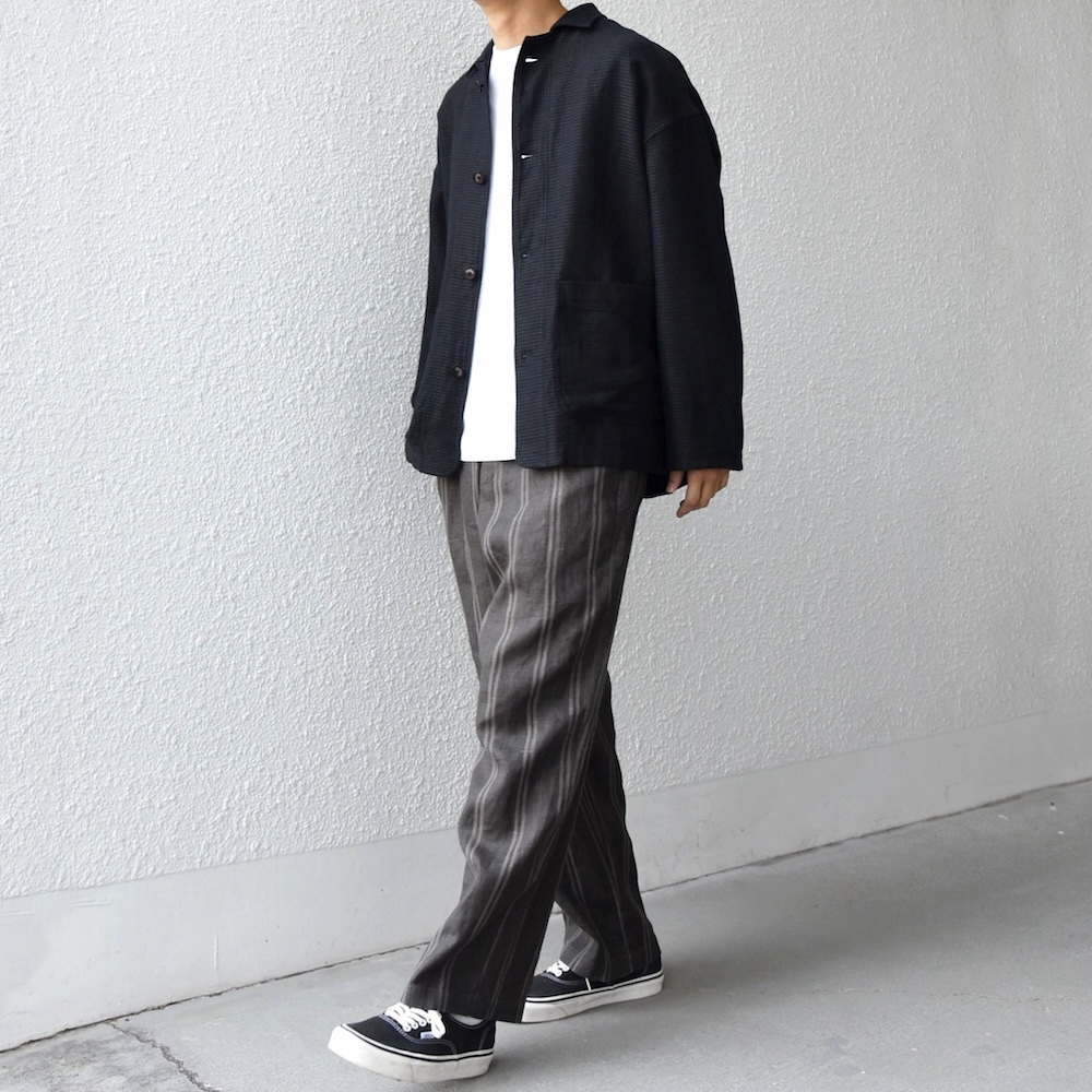 Tシャツと合わせた軽やかなスタイルから、同素材のシャツジャケットとのセットアップもオススメです。