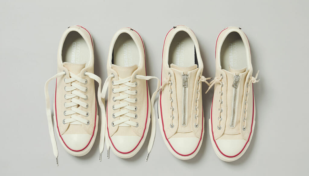 クラシックな外見と、防水透湿性を両立させた「ALL STAR GORE-TEX OX」をベースモデルに採用し、アイコニックなジッパーユニットを組み合わせたデザイン。シューホールとジッパーユニットのリンクを追求すべく、幾度も修正を重ね、スマートなデザインとフィットする履き心地を実現している。
