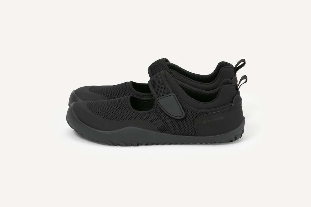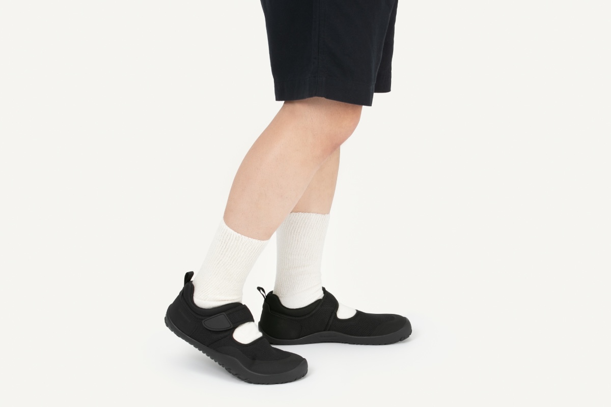 足袋のように踵の高さをなくすことで、裸足に近い履き心地に。つま先部分は、親指から小指にかけて実際の足の形のように斜めにカットされた形状で足指が広げやすく、地面を踏ん張れる仕様になっています。