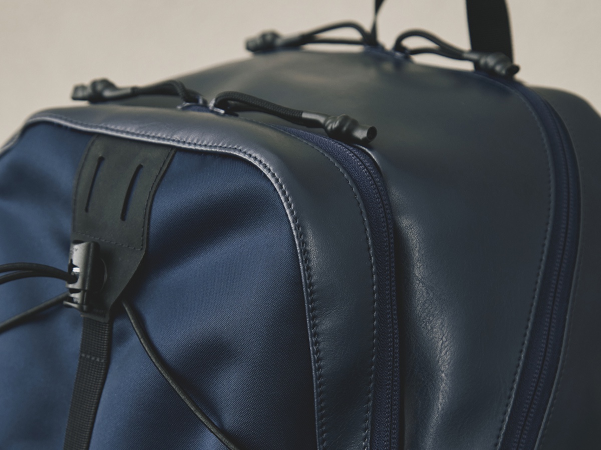 素材には光沢抑えめのエコレザーと、適度なツヤが美しいナイロンのコンビネーションを採用。2種類のマテリアルによる繊細なコントラストがアーバン感漂うルックスに奥行きを与える、コラボレーションならではのワンランク上の仕様とした。