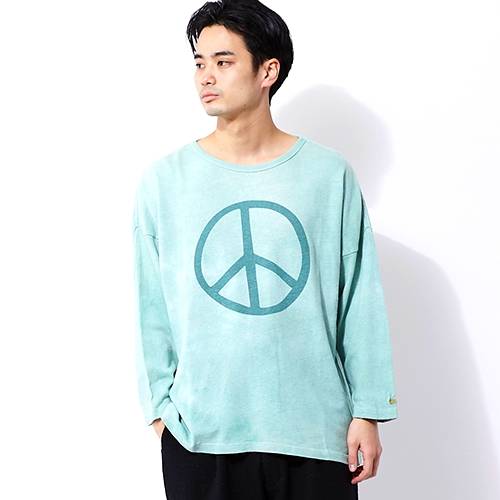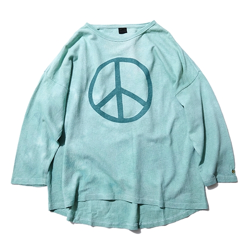 ヘンプブレンドの透湿性に優れるオリジナルのボディを使い、リラックスして着られるルーズなロンTに。手染めによる美しいタイダイカラーと脱力感のあるピースマークが調和。