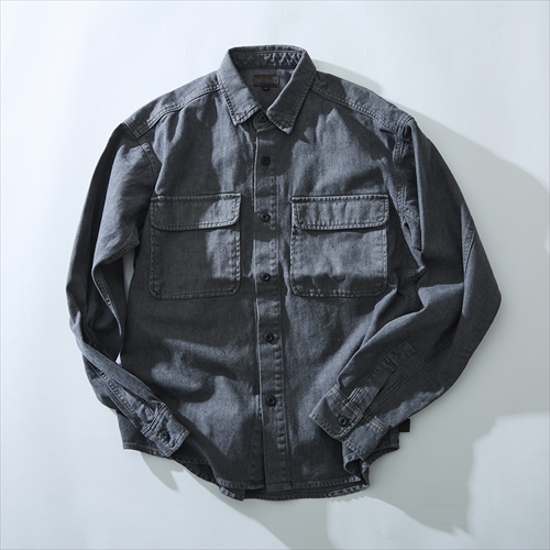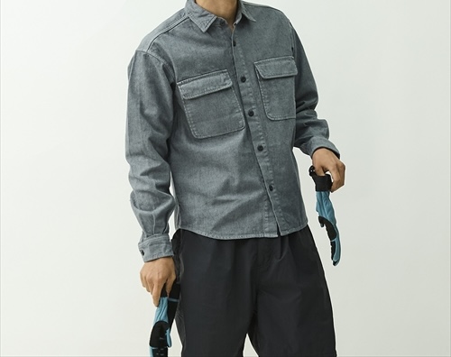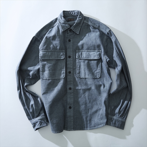 デニム調のボディはタフに着こなせるコットン×ヘンプによるやや厚手の生地を採用。製品染めで古着のような質感を表現し、胸元には大きめのフラップポケットを配置。