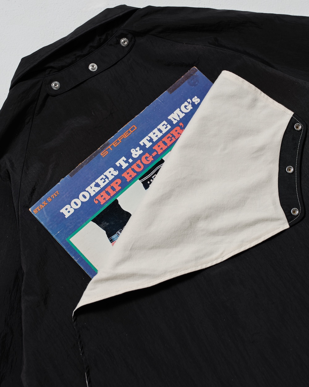 何の変哲もないコーチジャケットですが、前面と背面には LPレコードも収容可能な大容量ゲームポケット、左右にも収納スペースが備わっていて、手ぶらで外出しても、出先で増えた荷物を受け止められる設計に。