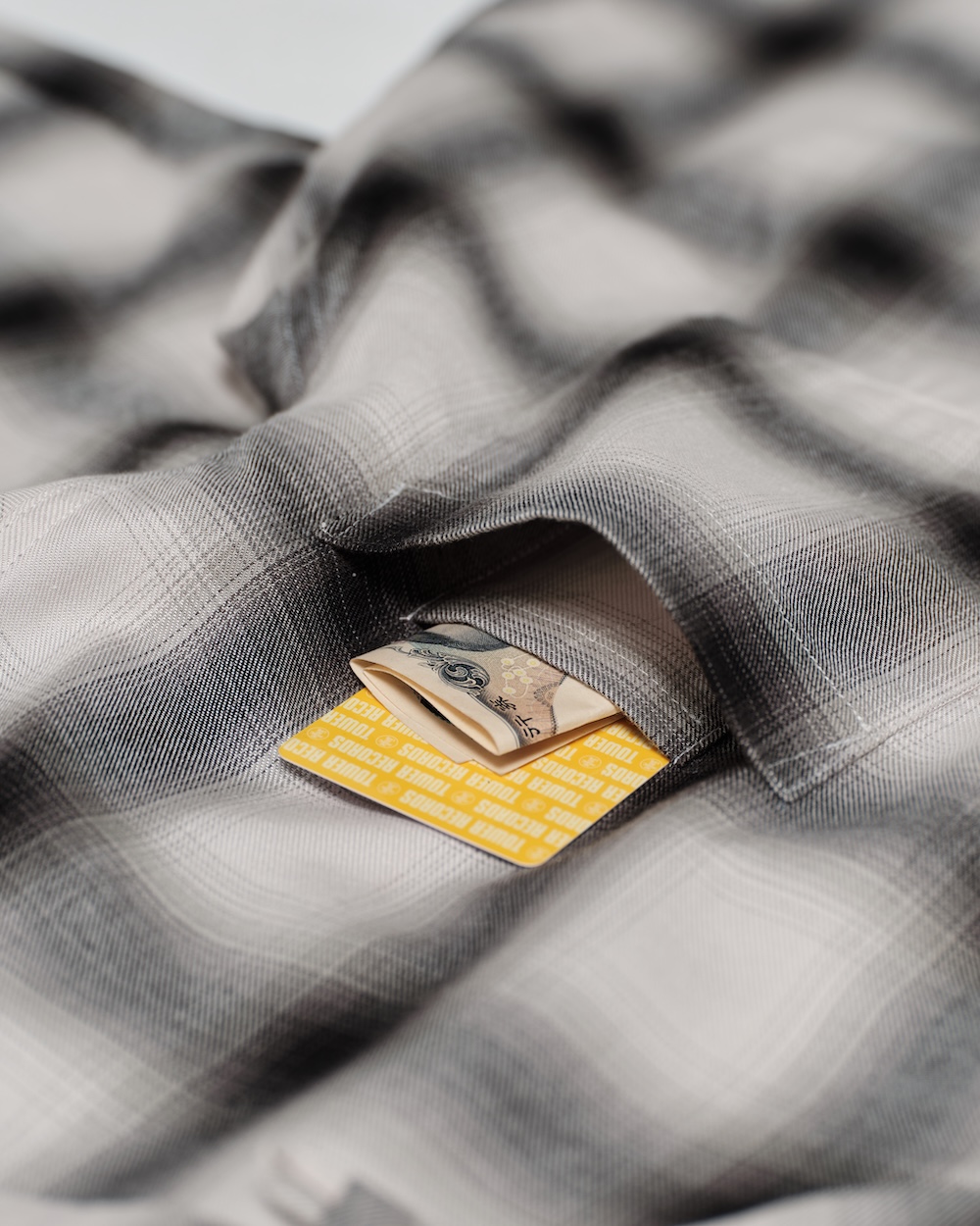こちらの開襟シャツは、胸元にメガネホルダー、裾裏にメガネ拭き、胸ポケット内部にカードサイズのサブポケットを配置。酒場やクラブで過ごしている最中でも、アイウエアを落としにくく、レンズ汚れもすぐに対応でき、身分証やクレジットカードを手早く出せるようなギミックが散りばめられています。
