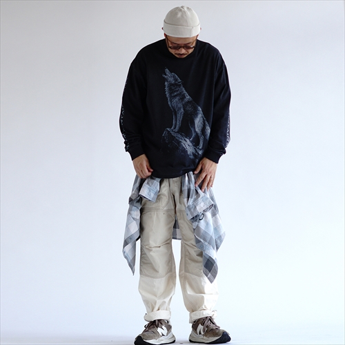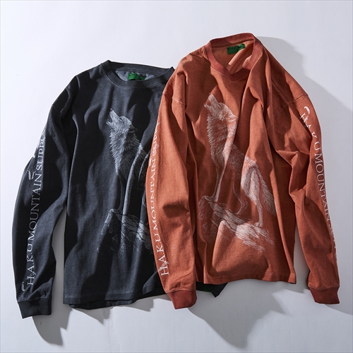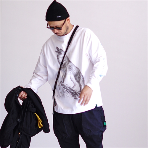 ヘビーウェイトのボディに顔良染めを施し、まるでヴィンテージを思わせるこなれた風合いを実現。遠吠えするオオカミを描いた、躍動感のあるグラフィックも存在感たっぷり。