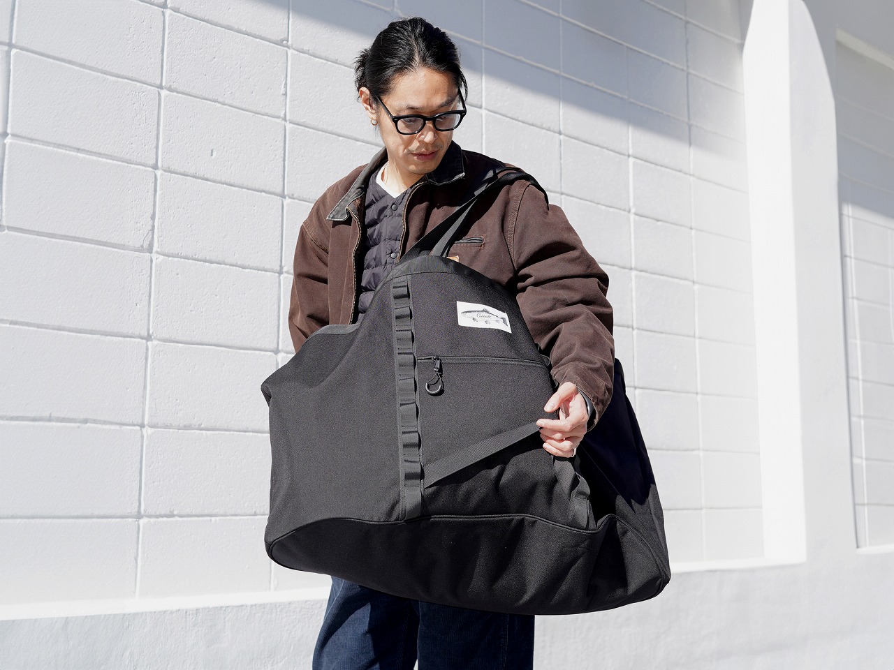 幅80、縦50、マチ30cmの大容量サイズ(容量約100L)。トート型を模した、まさに“ストレージバッグ”だ! ソフトコンテナとしてキャンプギアを入れるもよし、工具などのクル用アイテムを積んで車載しておくもよし、自宅では洋服やシューズの保管に使うもよし、様々な使い方が可能だ。