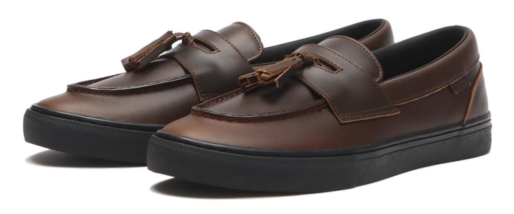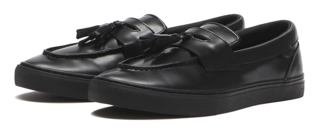 スニーカー感覚の履き心地と合わせやすさが魅力のVANS LOAFERを、光沢強めのガラスレザーでメイク。着脱できるタッセルも追加し、さらにクラシック&フォーマルな雰囲気に。ラフなスウェットはもちろん、上品めのジャケットやタイドアップともマッチする高汎用モデルに仕上げた。