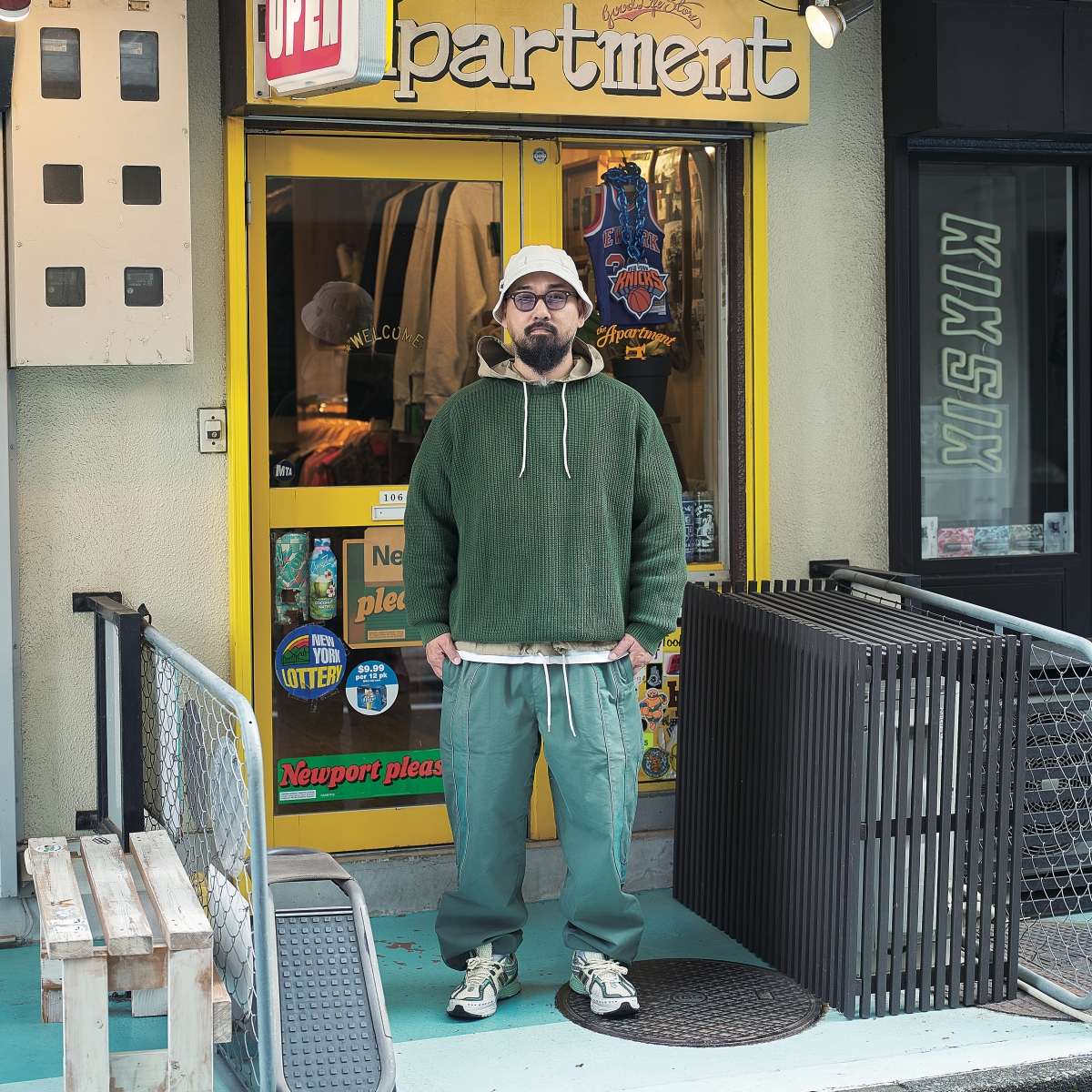 90年代のBボーイ的な視点で、アメリカのウエアや雑貨を厳選するジ・アパートメントを運営。今秋よりニューエラアウトドアのディレクションも担う。「最近は、釣りにハマっていて、春は野尻湖に行きたいです」。オリジナルブランド、スタブリッジのアイテムと古着をミックスしたスタイル。「パンツは新作で4月中には入荷できると思います」。ショアウォーカーアノラック¥24200、トラックパンツ(価格未定)、リバーシブルジャングルハット¥7700/すべてスタブリッジ ニットセーター/エル・エル・ビーン、シューズ:1906R/ニューバランス×エメレオンドレ(ともに私物)