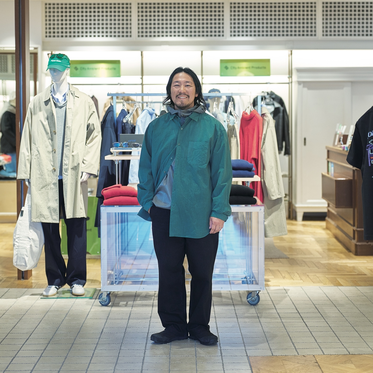 ショップのバイヤーとしても活躍する店長。自転車が趣味のなか、最近は登山にもハマり、関東近郊の低山ハイクを楽しんでいる。「今夏は、釣りにも挑戦したいので、渓流釣りができる山を歩いてみたいです」。ダブルジャケットをカジュアルなウエアで着崩したスタイル。「ジャケットのカラーをベースに、なんとなく色味を統一してみました」。ザ スタンド リネンブレンド Wジャケット¥45100/ザ ナーディーズ ハンドウーブフリドジップフーディ¥50600/レースイプサ ヴィンテージストライオレッグ¥37400/オーセン ハット/古着、シューズ/ビレッジピーエム(ともに私物)